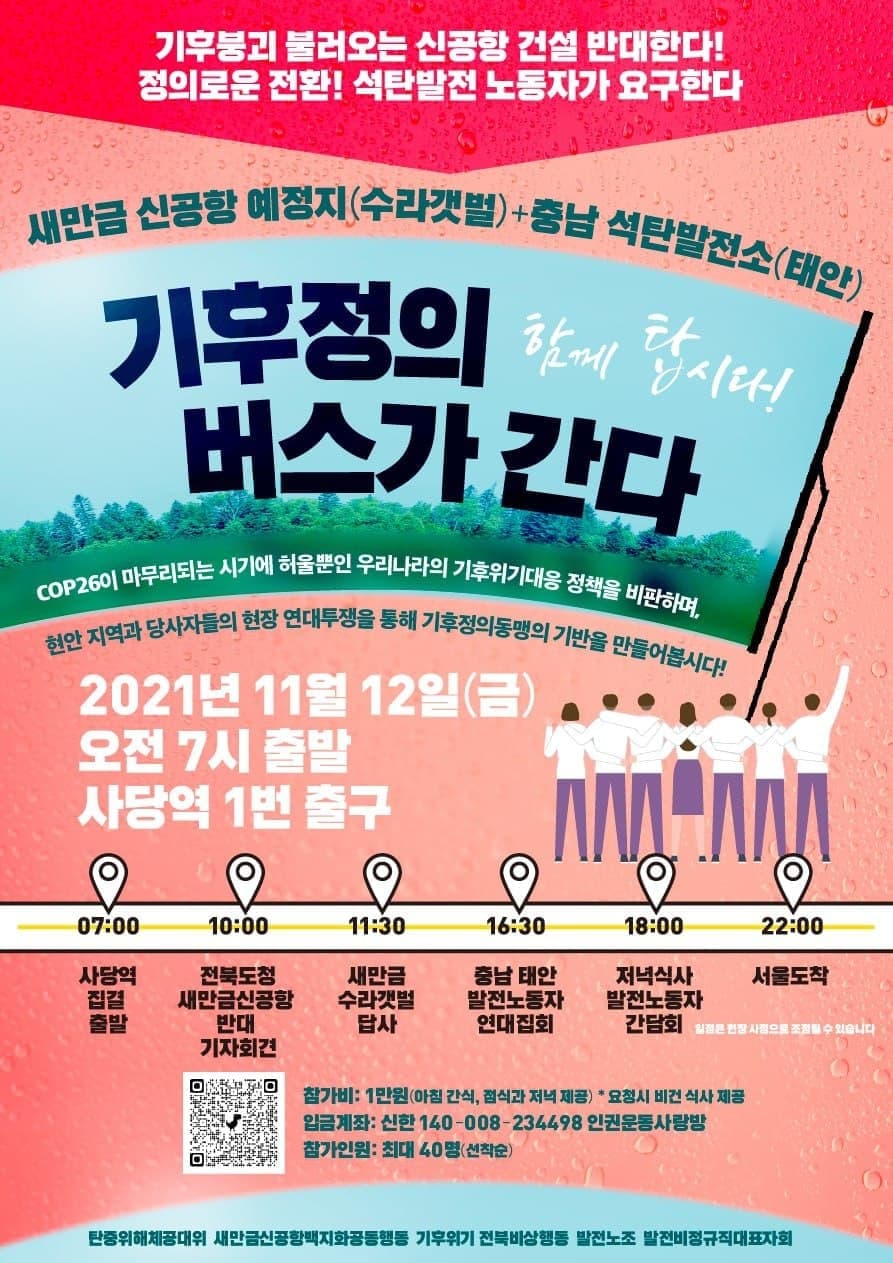 1. 탄중위해체공대위(이하 공대위)는 11월 12일(금) 전북 새만금과 충남 태안을 방문하는 ‘기후정의버스’를 운행하였다. 서울, 부산 그리고 대전의 활동가와 시민들 40여명이 참여하였다. 전북도청 앞에서 새만금 신공항 계획을 반대하는 기자회견, 신공항 예정부지인 수라갯발 답사, 그리고 석탄발전소 폐쇄가 예고된 충남 태안에서 진행한 노동자 연대 집회가 진행되었다. 이번 사업은 새만금신공항백지화공동행동, 기후위기전북비상행동, 발전노조, 발전비정규직전국대표자회의가 공동으로 추진했다.