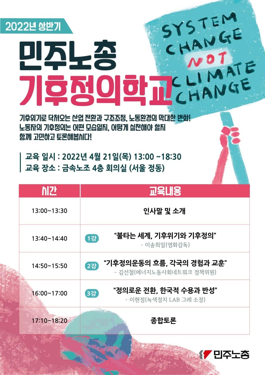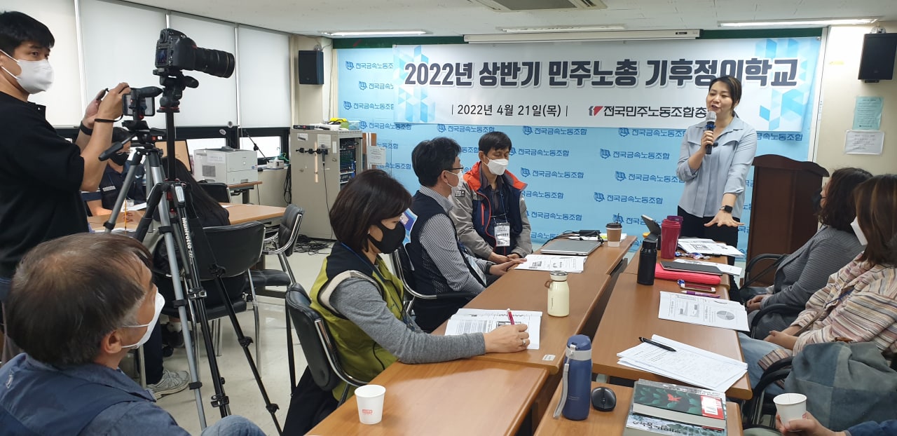 지난 4월 21일, 민주노총에서는 처음으로 기후정의학교가 열렸습니다. 작년 말, 민주노총에 기후위기대응특별위원회가 정식으로 발족한 후 처음 열린 큰 사업이기도 합니다. 전국 지역본부와 산별노조의 기후위기 담당자들이 한 자리에 모였습니다.