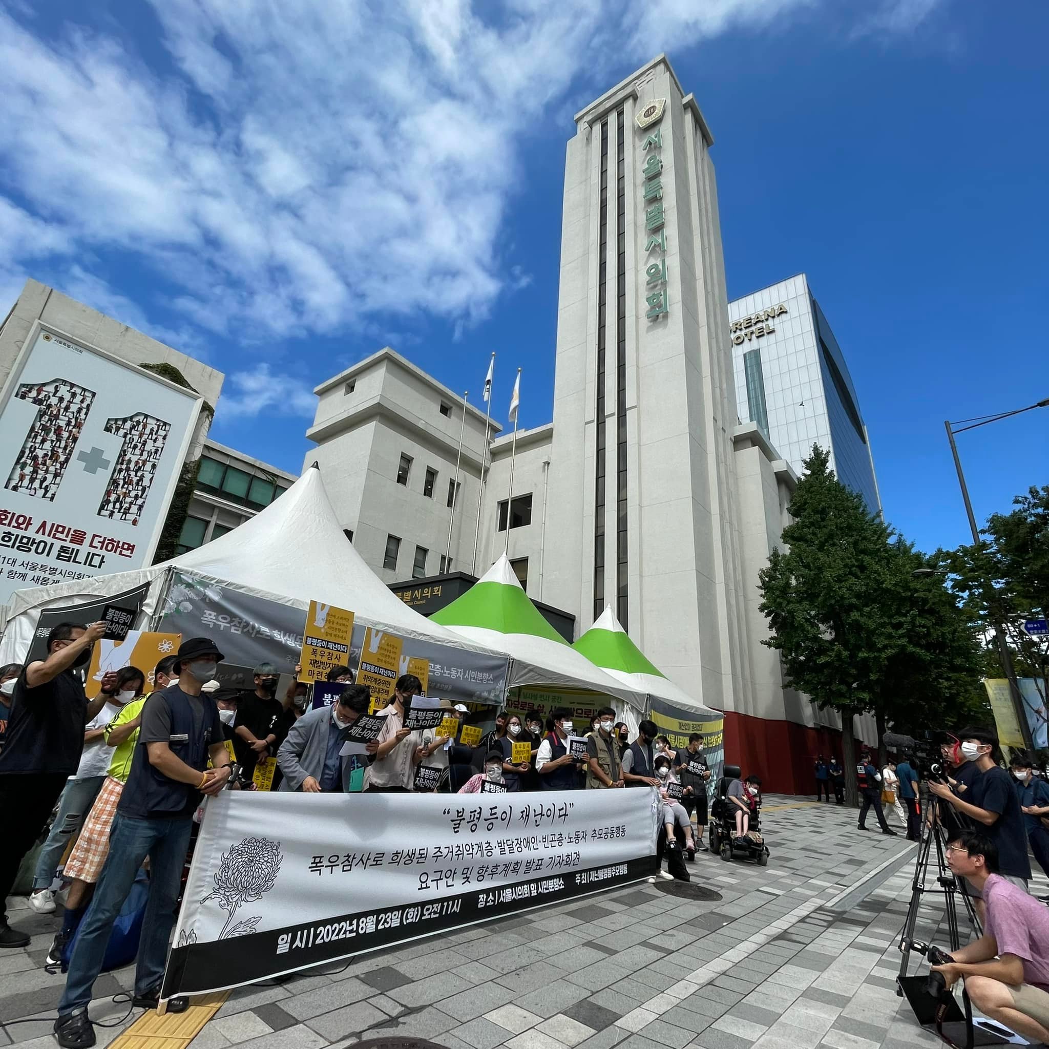 기후 재난은 불평등한 사회 구조를 타고 흘러 약한 곳에 머무는 사람들을 덮치고 있다. 기후위기와, 이윤만을 좇는 사회, 무분별한 개발이 낳은 재난에 우리의 이웃들이 목숨을 잃었다. 다시는 이러한 비극이 발생하지 않도록 하기 위해, 우리는 177개 노동사회시민단체의 힘을 모아 <재난불평등추모행동>을 구성했다. <재난불평등추모행동>은 지난 8월 16일부터 23일까지 이곳 서울시의회 앞에 시민분향소를 차려 폭우참사에 희생된 이들의 넋을 기렸다. 많은 시민들이 이곳 분향소를 찾아 함께 눈물 흘리며, 다시는 이런 일이 없어야 한다는 뜻을 모았다. 이 마음들을 모아 우리는 지금부터 불평등한 재난 사회의 대전환을 촉구하는 본격적인 행동에 돌입하고자 한다.