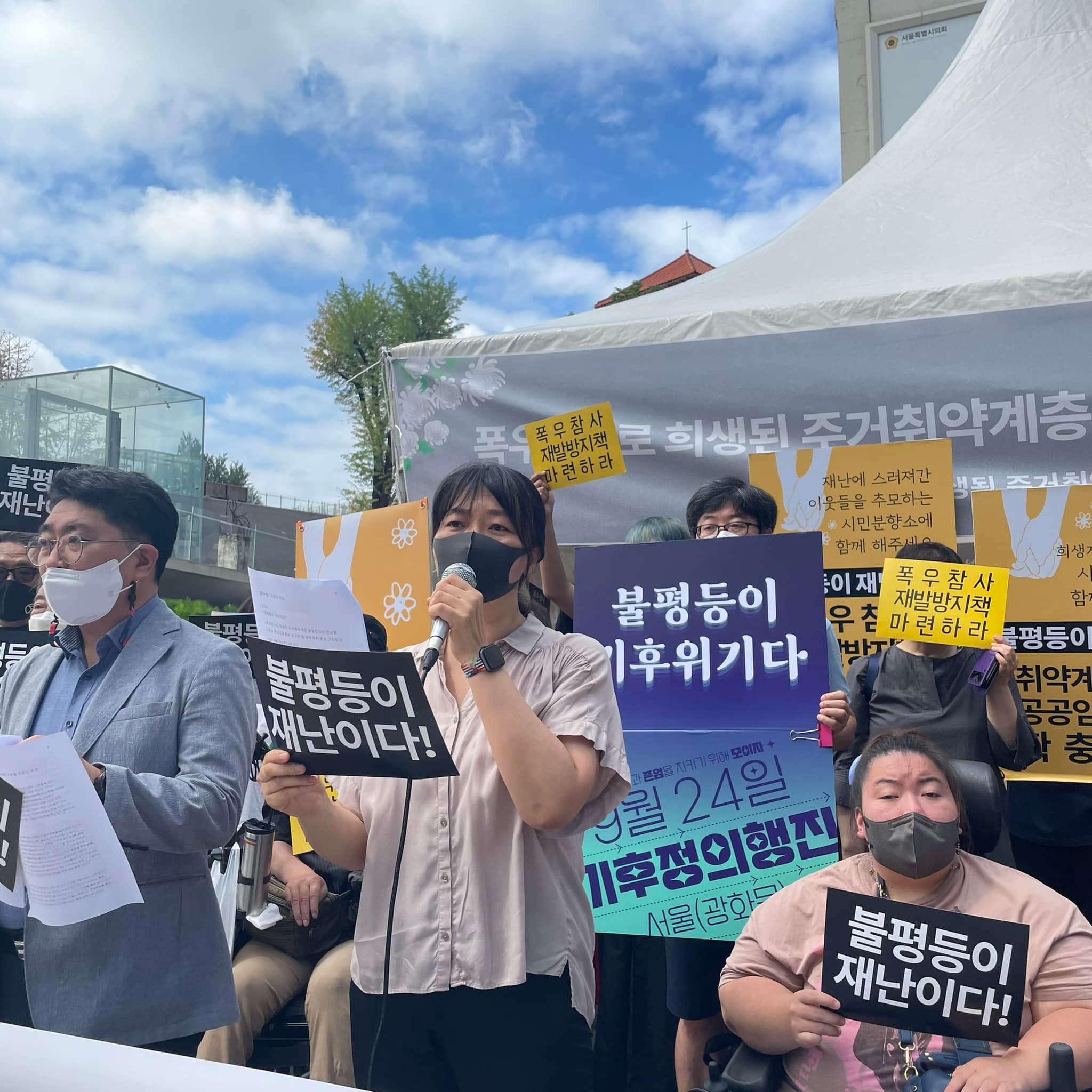 가난하거나 장애를 가졌다는 이유로 재난 위험에 내몰려 목숨을 잃는 일은 다시는 없어야 한다. 폭우참사로 희생된 주거취약계층, 발달장애인, 빈곤층, 노동자의 목소리를 모아 우리는 직접행동에 나설 것이다. 직접행동의 주요계기는 9월 24일 서울에서 펼쳐질 기후정의행진, 10월 1일 세계 주거의 날 등이 될 것이다. 우리는 즉각적인 기후위기 대응책과 기후재난 대응방안을 요구할 것이다. 또한 우리는 모두의 주거권 보장과 주거불평등 해소를 위해 장기공공임대주택 확충을 위해 싸울 것이다. 또한 우리는 장애인이 지역사회에서 함께 살 권리, 발달장애인 24시간 지원체계 보장을 함께 요구할 것이다. 또한 우리는 국민기초생활보장제도 수급자와 빈곤층의 즉각적인 주거안정 보장을 요구할 것이다. 또한 기후재난 발생 시 노동자의 안전하게 일할 권리와 모든 노동자의 주거권 보장을 위해 함께 싸울 것이다.