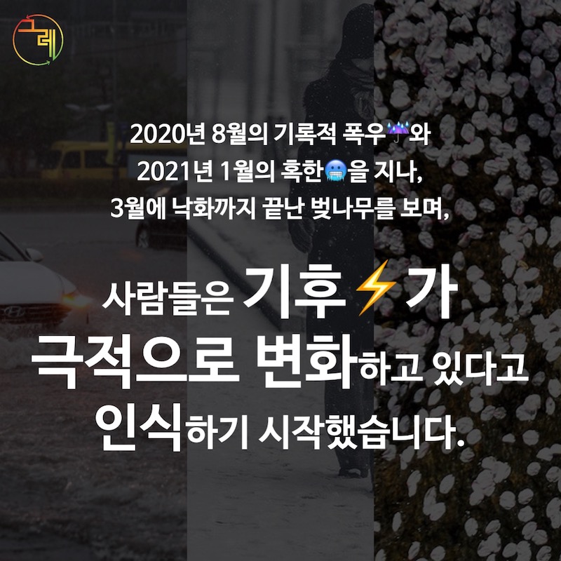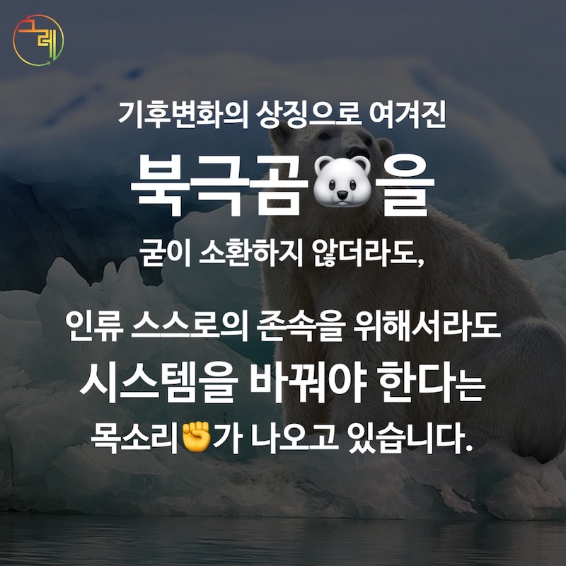 오랜시간 기후변화의 상징으로 여겨졌던 북극곰을 굳이 소환하지 않더라도, 북극의 기후 변화가 우리나라에 직접적으로 영향을 준다는 사실을 확인했고, 인류 스스로의 존속을 위해서라도 지금의 시스템을 바꿔야 한다는 목소리가 나오고 있습니다.