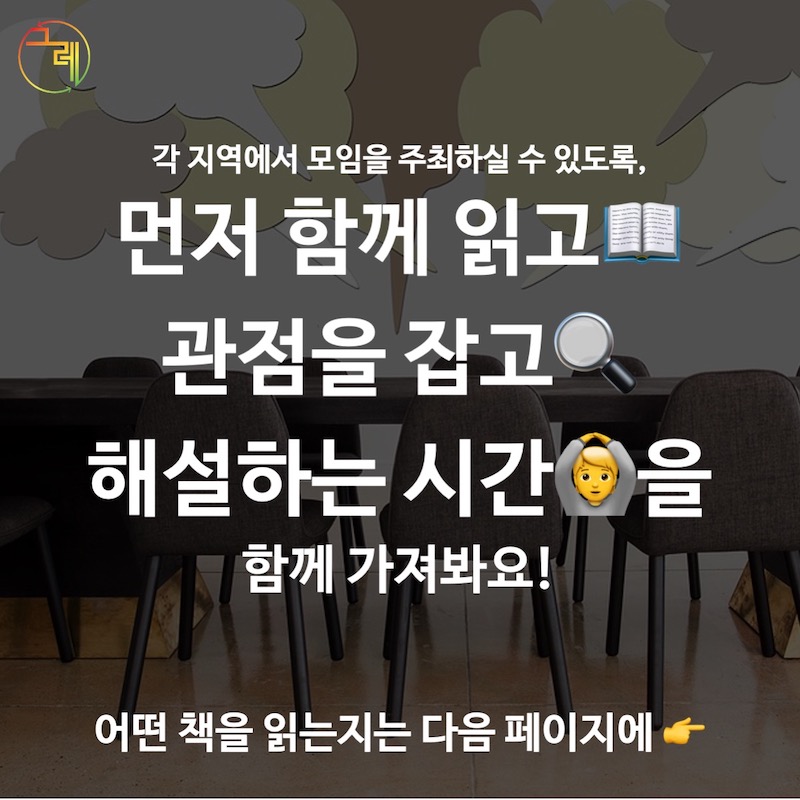 각 지역에서 모임을 주최하실 수 있도록, 먼저 함께 읽고, 관점을 잡고, 해설하는 시간을 함께 가져봐요.